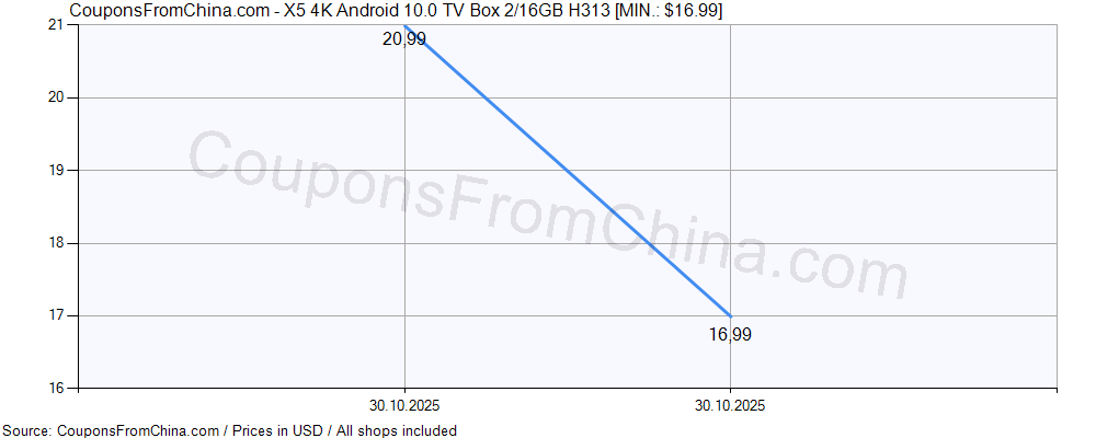Check out price history chart (for all/most countries) for X5 4K Android 10.0 TV Box 2/16GB H313. The lowest price was: $16.99.