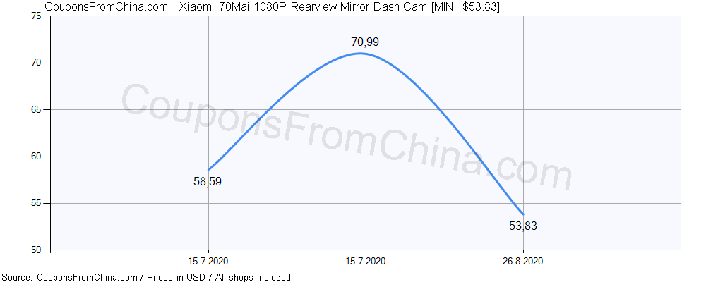 Check out price history chart (for all/most countries) for Xiaomi 70Mai 1080P Rearview Mirror Dash Cam. The lowest price was: $53.83.