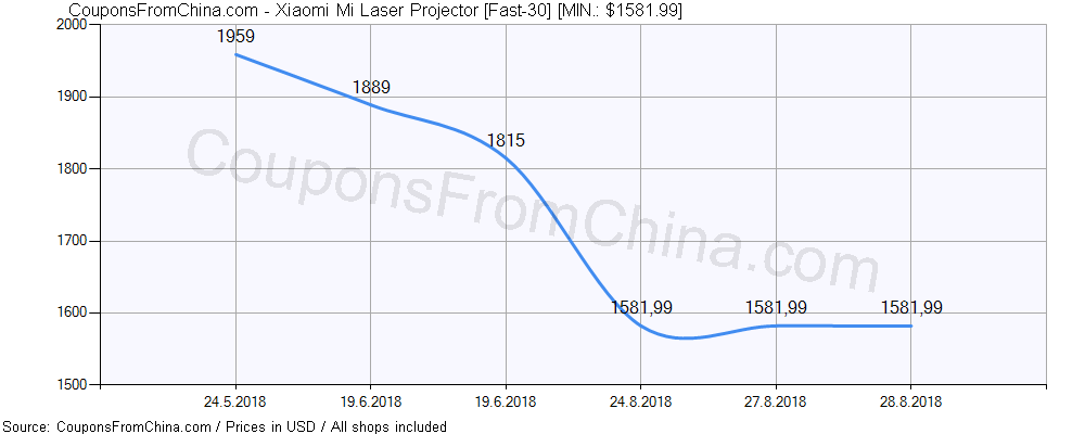 Do you need price history chart (for all/most countries) for Xiaomi Mi Laser Projector [Fast-30]? There we go. The lowest price was: $1581.99.