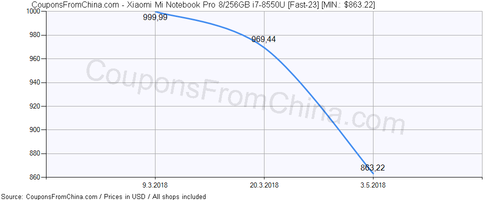 Do you need price history chart (for all/most countries) for Xiaomi Mi Notebook Pro 8/256GB i7-8550U [Fast-23]? There we go. The lowest price was: $863.22.