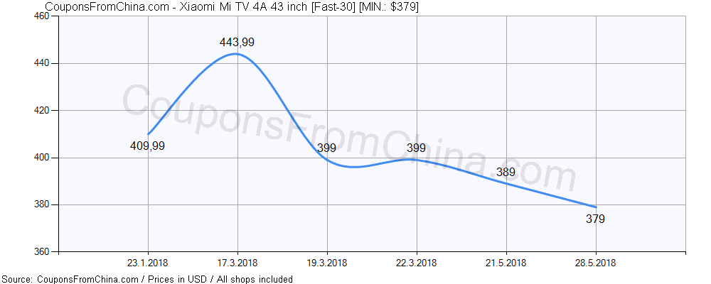 Here is price history (for all/most countries) for Xiaomi Mi TV 4A 43 inch [Fast-30]. The lowest price was: $379.