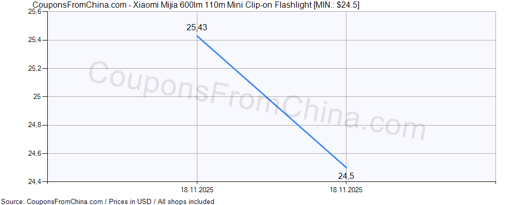 Price history (for all/most countries) for Xiaomi Mijia 600lm 110m Mini Clip-on Flashlight is here. The lowest price was: $24.5.