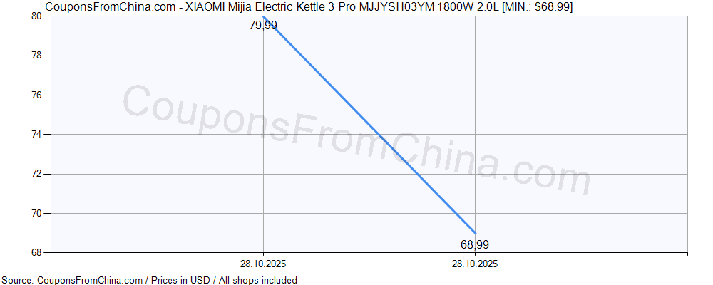 Do you need price history chart (for all/most countries) for XIAOMI Mijia Electric Kettle 3 Pro MJJYSH03YM 1800W 2.0L? There we go. The lowest price was: $68.99.