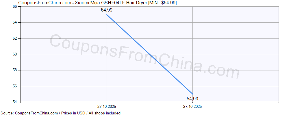 Do you need price history chart (for all/most countries) for Xiaomi Mijia GSHF04LF Hair Dryer? There we go. The lowest price was: $54.99.