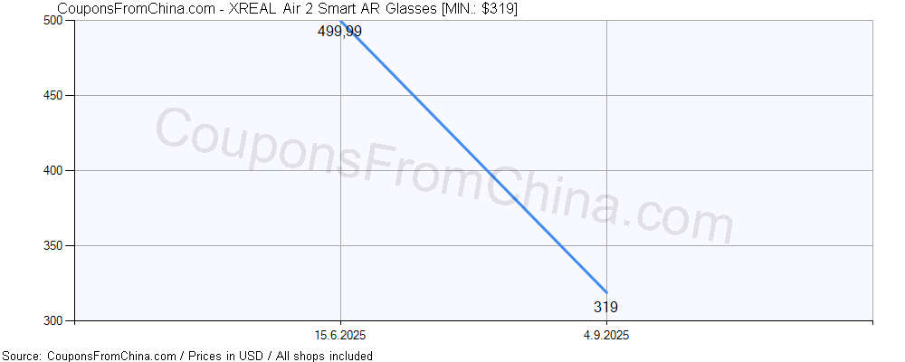 Here is price history (for all/most countries) for XREAL Air 2 Smart AR Glasses. The lowest price was: $319.