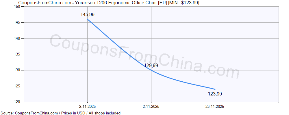 Price history (for all/most countries) for Yoranson T206 Ergonomic Office Chair [EU] is here. The lowest price was: $123.99.