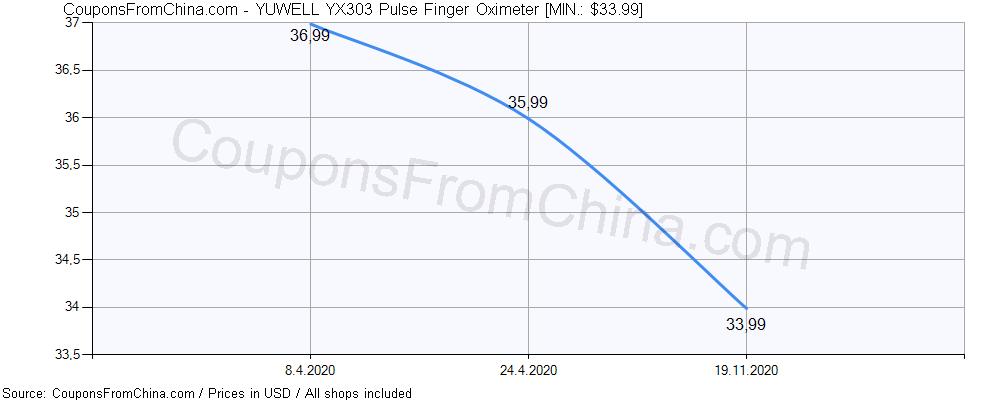 Do you need price history chart (for all/most countries) for YUWELL YX303 Pulse Finger Oximeter? There we go. The lowest price was: $33.99.