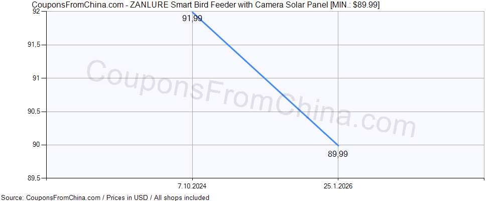 Here is price history (for all/most countries) for ZANLURE Smart Bird Feeder with Camera Solar Panel. The lowest price was: $89.99.
