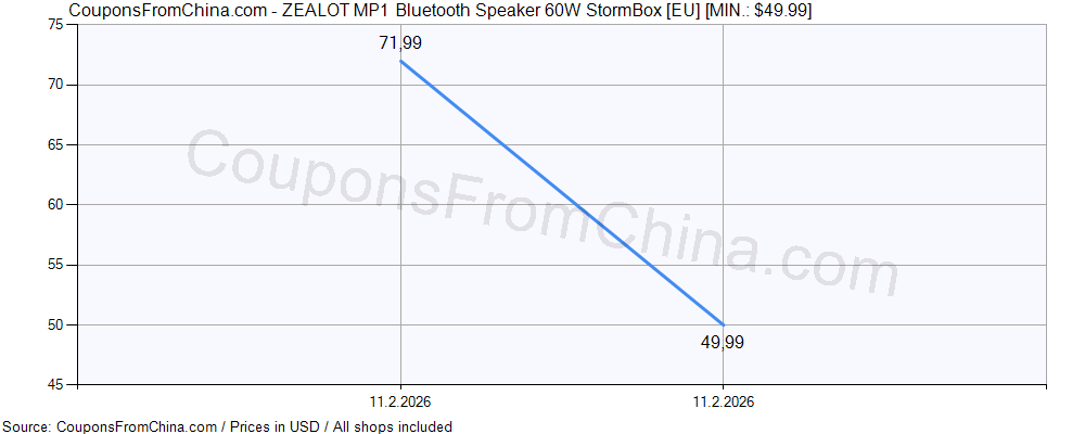 Check out price history chart (for all/most countries) for ZEALOT MP1 Bluetooth Speaker 60W StormBox [EU]. The lowest price was: $49.99.