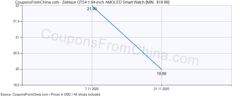 Do you need price history chart (for all/most countries) for Zeblaze GTS4 1.94-inch AMOLED Smart Watch? There we go. The lowest price was: $19.99.