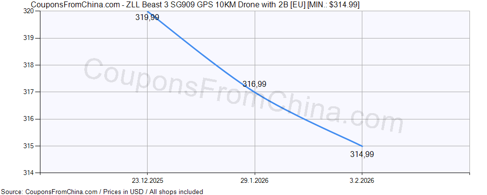Here is price history (for all/most countries) for ZLL Beast 3 SG909 GPS 10KM Drone with 2B [EU]. The lowest price was: $314.99.